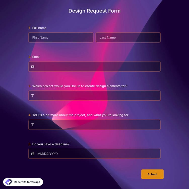 Are you looking for a design for your brand or your personal use from creative designers? Use our online design request form template to create your request form in only a few minutes. You do not need any coding skills to create your form! Created by forms.app Team