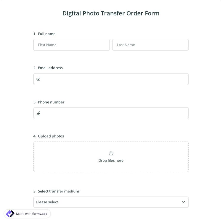Online forms are a seamless way to process digital photo transfer orders. With forms.app, you can simplify the process by using this free template. Accept customer orders, manage details, and provide exceptional service—all in one place.