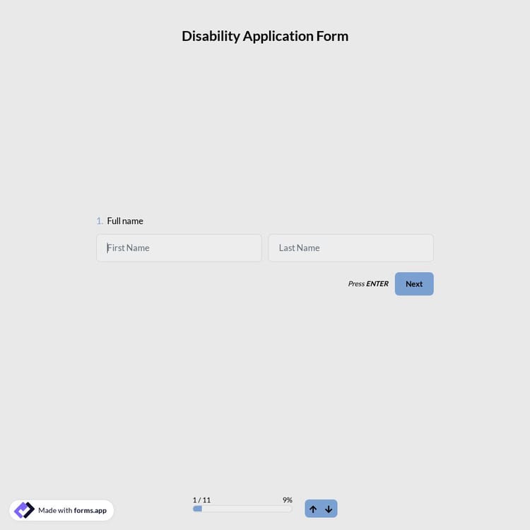 A disability application form is an online document used by private or government agencies to benefit people with disabilities on issues such as salary and job position. Disabled people can apply to the relevant institutions by filling out this form online. You can use this template for free on forms.app.