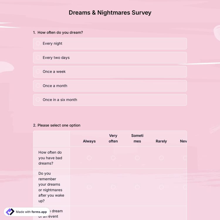 Do you want to see what effect dreams and nightmares have on people? With the dreams & nightmares survey template, you can find out what kind of visions people see in their daily lives and their effects. Register on forms.app to create your own form now!