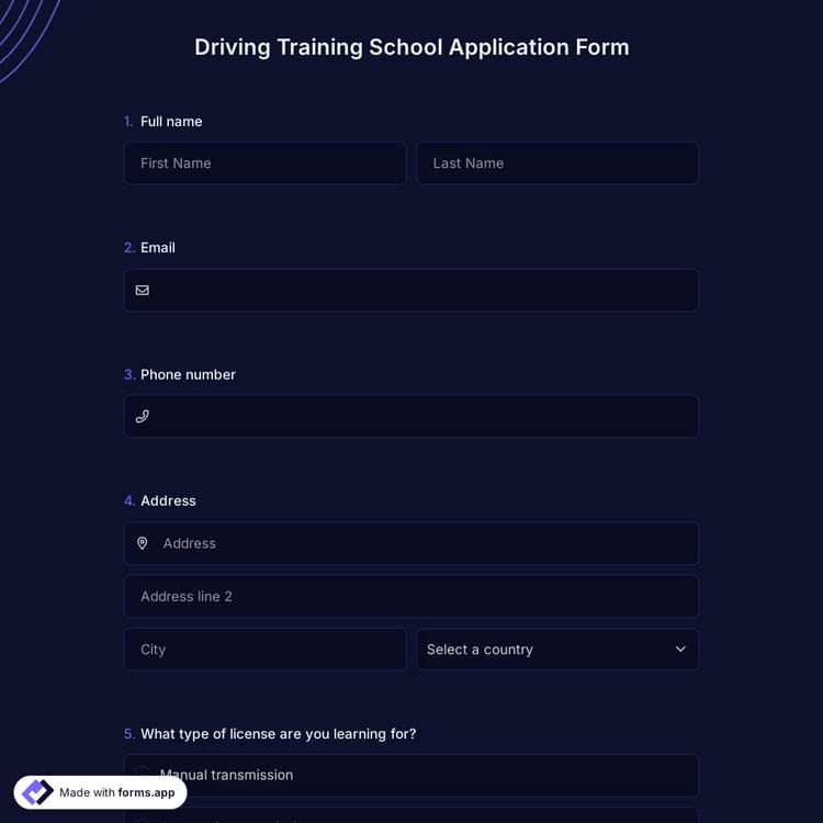 You can easily use this driving training school application form template and build your own form on forms.app. You may send your forms by email, distribute them on social media, embed them on a website, and generate custom URLs for them with forms.app. select your sharing options and get applications for your school!