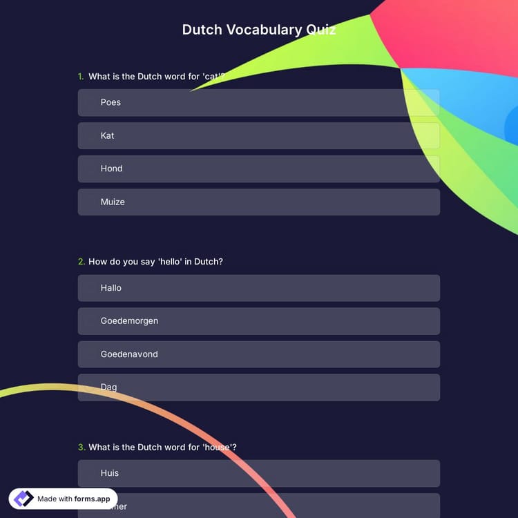 A Dutch vocabulary quiz is an engaging tool designed to test and improve participants’ knowledge of Dutch words and phrases. It can include multiple-choice questions, word-match exercises, and fill-in-the-blank activities. With forms.app, creating and sharing such quizzes becomes quick and easy, catering to learners at all levels.