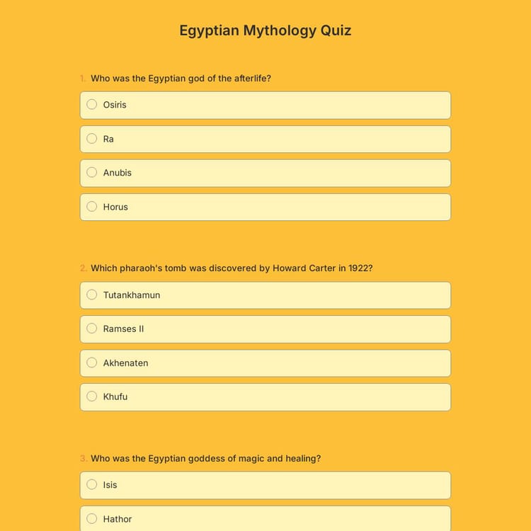 An Egyptian mythology quiz is a set of questions designed to challenge and educate participants about ancient Egypt's myths, gods, and historical wonders. From Osiris’s journey to the afterlife to the construction of pyramids, this quiz covers a wide range of intriguing topics. Perfect for classrooms, trivia events, or personal fun!