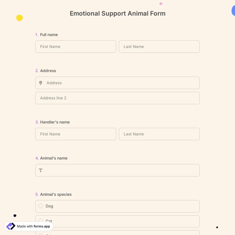 Although it does not require the same certification and training as a professional service animal, an emotional support animal should still be treated like a pet. If you are planning to provide people with these helpful animals, you can gather the necessary information with an online form. You can easily build your form and use forms.app to gather related data and maintain pleased patients.