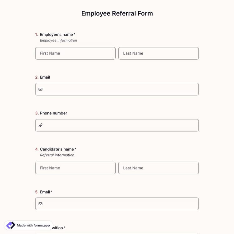 There are many ways to employ new people for a job. Hiring processes include job finder sites, social media posts, or even newspapers. Usually, candidates will apply themselves with application forms (which you can create by using forms.app, by the way) and be involved with the company’s human relations departments. Another very effective way is referrals. Sometimes, not seldom, an employee might refer a person to a position. These are done with the help of employee referral forms. forms.app has an employee referral form template ready to use to help you.