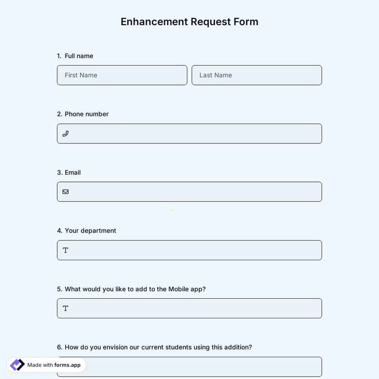 Enhancement request forms allow you to collect ideas for changes and improvements to your service or product from your target audience or employees. With each evaluation or feedback, you can identify the ideas and needs of the requestors. You can improve your user experience and refresh your image with survey results.forms.app's free request form templates will help you create professional forms. On this platform, your forms will look completely personal and professional. For example, you can add your brand or organization's logo or icon to the form to create a field that represents you best. You can create your form in minutes with many smart features and a user-friendly interface!