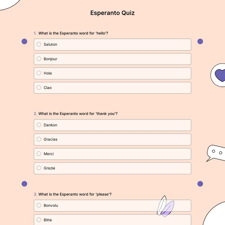With this free Esperanto quiz form template, you can create interactive quizzes that help learners practice vocabulary, grammar, and cultural facts. Open this customizable template today and start building your own quiz effortlessly!