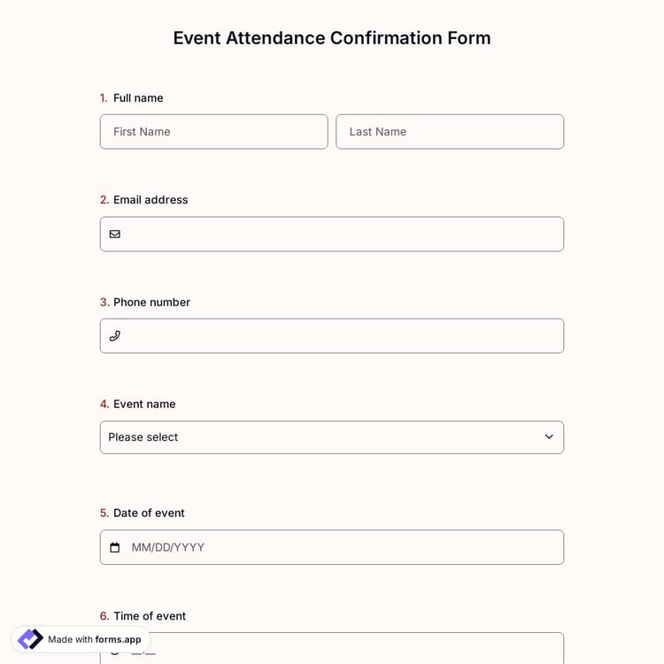 Confirming your event attendees has never been easier! An event attendance confirmation form is a quick and reliable way to collect RSVPs and essential details from your guests. Click "Use Template" and streamline your event planning today.