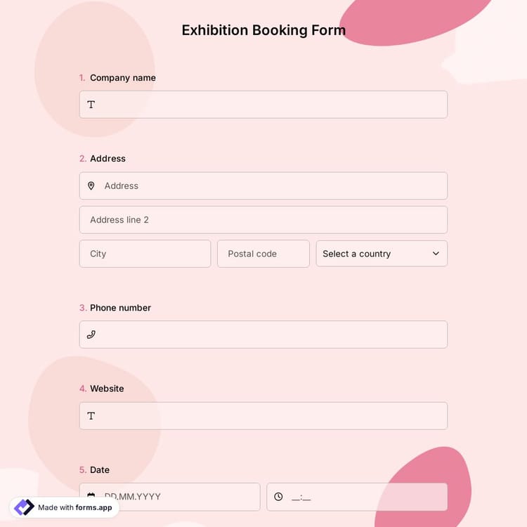 An event booking form, like this exhibition booking form, can be shared directly with people via social media or embedded on a website. If you prefer a traditional method, such as flyers you can share your form with a QR code, as well. See forms.app’s sharing options and guides for creating and sharing the best online form. Start creating your form today with this free exhibition booking form template.