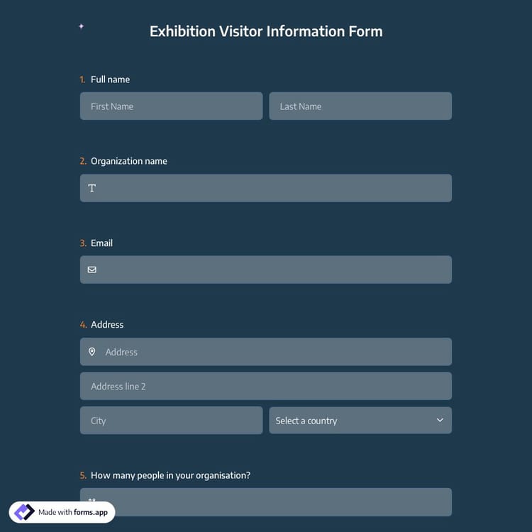 Our template is very easy to use and free, and you do not need any coding skills. To create your very own application form, visit forms.app, choose the “Exhibition Visitor Information Form Template” from our wide selection, and get started!