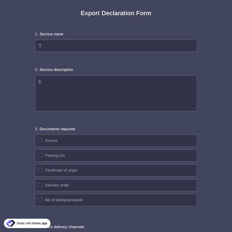 With the export declaration form, you'll be able to save time and paperwork by doing everything electronically, including printing and sending a copy of the declaration to your client. Thanks to forms.app you will be able to do all of these at no charge!