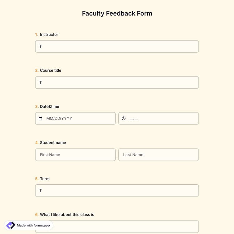 Educational institutions use faculty feedback to measure overall success in education. Students fill out the faculty feedback form to gather information about educational tools, instructor evaluations, and courses. The faculty feedback form is a great way to identify areas of improvement and development. You can use this faculty feedback form template on forms.app and create your own.