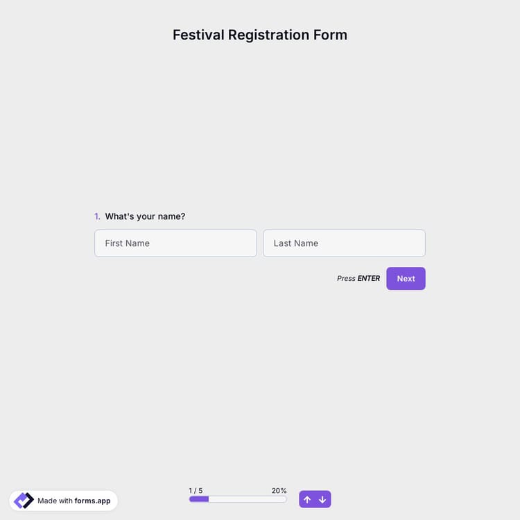 You can use this registration form template as a base and edit the questions according to your festival type. forms.app will provide countless handy features to customize your form. For example, you can add seating options for music festivals, ask for emergency contact, or offer different payment methods.