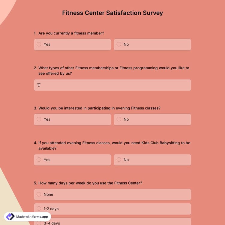 Gym managers can utilize a fitness center satisfaction survey to measure overall satisfaction with the fitness center. The fitness center satisfaction survey asks questions about the facilities of the fitness room, its cleanliness, the quality of sports equipment, and the attitude of trainers. This customer satisfaction survey is essential for assessing the gym. You can use the fitness center satisfaction survey template on forms.app with one click.