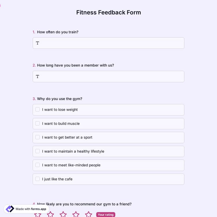 If you run a gym, you can quickly get customer feedback with this free fitness feedback form template. You can customize this fitness feedback form on forms.app. This customer feedback form will be helpful for your fitness service. You can use the fitness feedback form template in seconds.