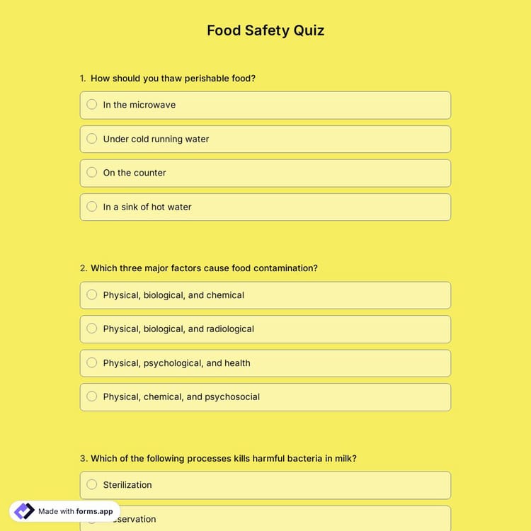 Take help from an online quiz to inform people about food safety practices. Use forms.app’s free food safety quiz template and create your quiz. Share your quiz with people and help them prevent foodborne illnesses!