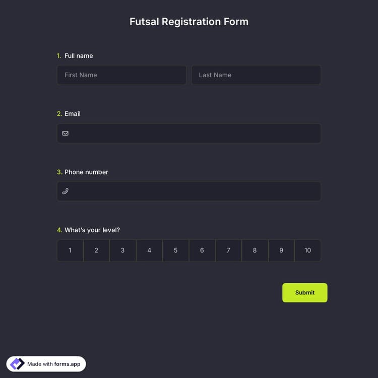 To collect the basic data (name, age, background sports info, occupation, education, etc.) of the members of your organization or club is so vital. If you are organizing a futsal tournament, you can easily get your online registration form by using forms.app and immediately create your own by clicking the “Use Template” button.
