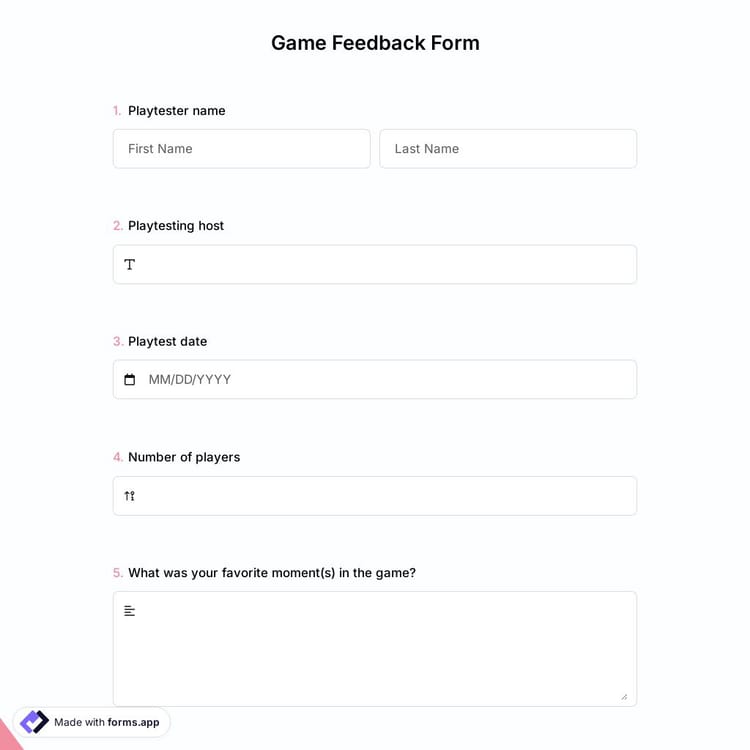 If you are a game developer or researcher, you can use this game feedback form to collect feedback from players. With player feedback form, you can quickly collect players' comments about the game and make improvements on those issues. You can start using the game feedback form template on forms.app.