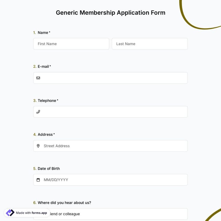 The membership form templates include questions for collecting personal information and contact information of future members, such as name and phone number. If you have different club memberships tiers, you can add these options on the edit menu. Furthermore, this form will collect any membership fees automatically. All you have to do is share your form on social media or embed it on your website. Create your form today with forms.app’s free generic membership application form template!