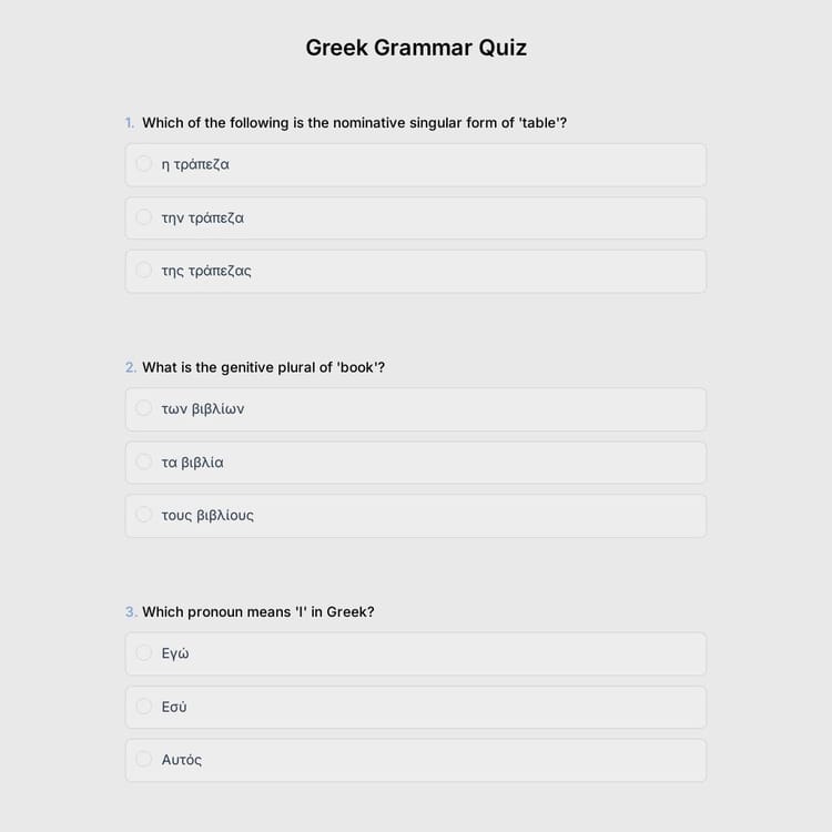 A Greek grammar quiz is a structured set of questions designed to assess a person’s understanding of Greek grammar rules and syntax. It covers topics such as verb conjugations, noun declensions, prepositions, and sentence structure. Ideal for students, educators, and language enthusiasts, this quiz helps reinforce learning in an interactive way.