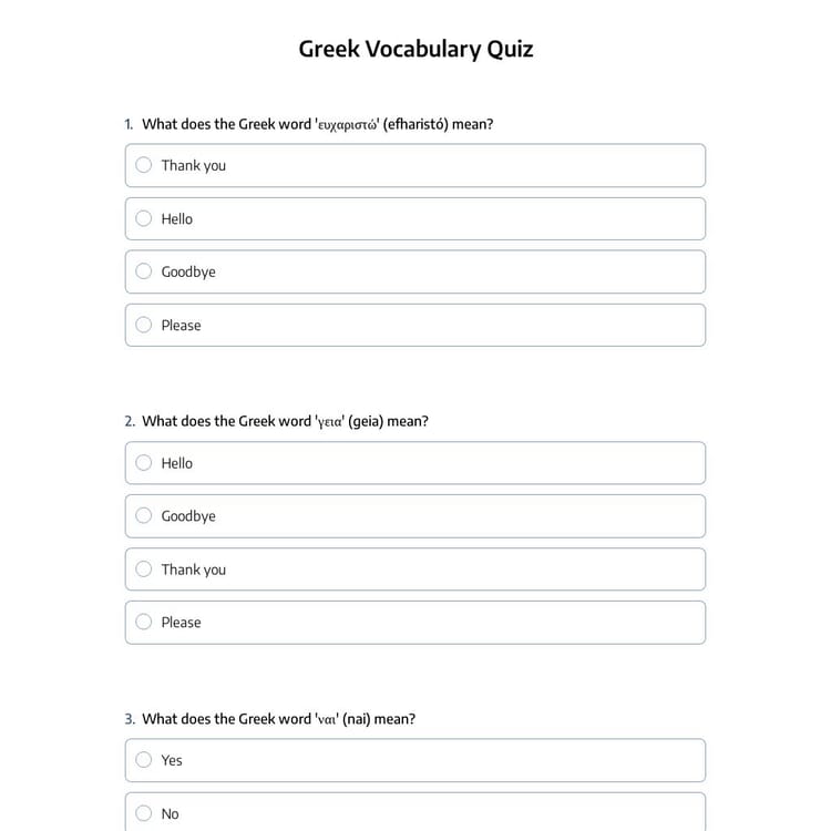 With the Greek vocabulary quiz template from forms.app, you can create engaging quizzes to enhance learning or evaluate proficiency. Click the “Use Template” button now and get started for free!