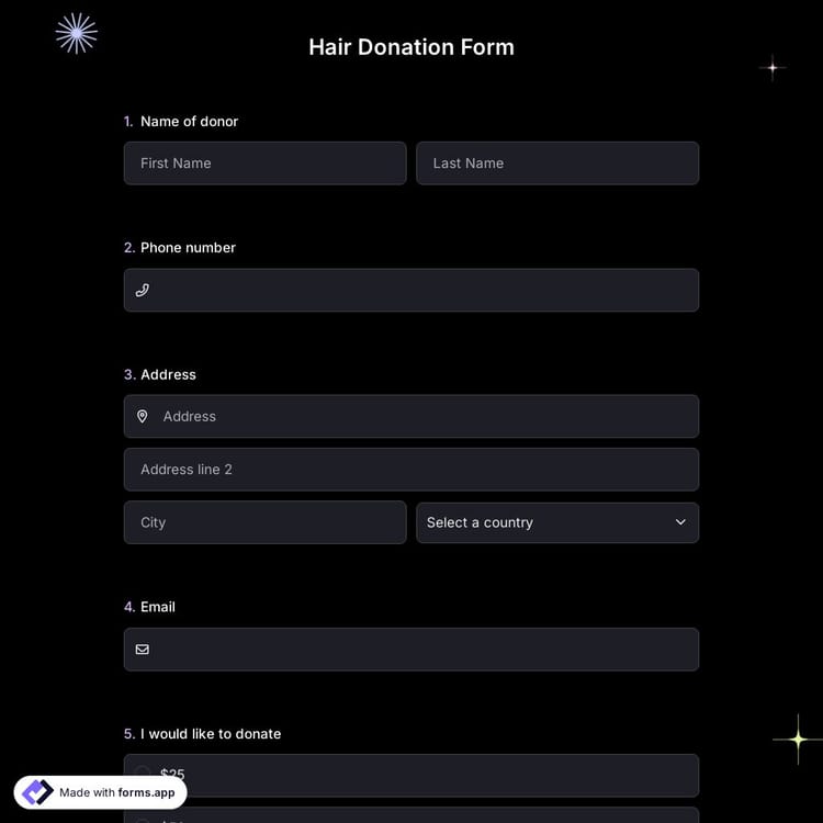 If a person decides to donate her/his hair to an organization, a hair donation form is required. The hair donation form includes questions about the hair's natural color, donor’s age, gender, and contact information. Get started to create the form with forms.app!