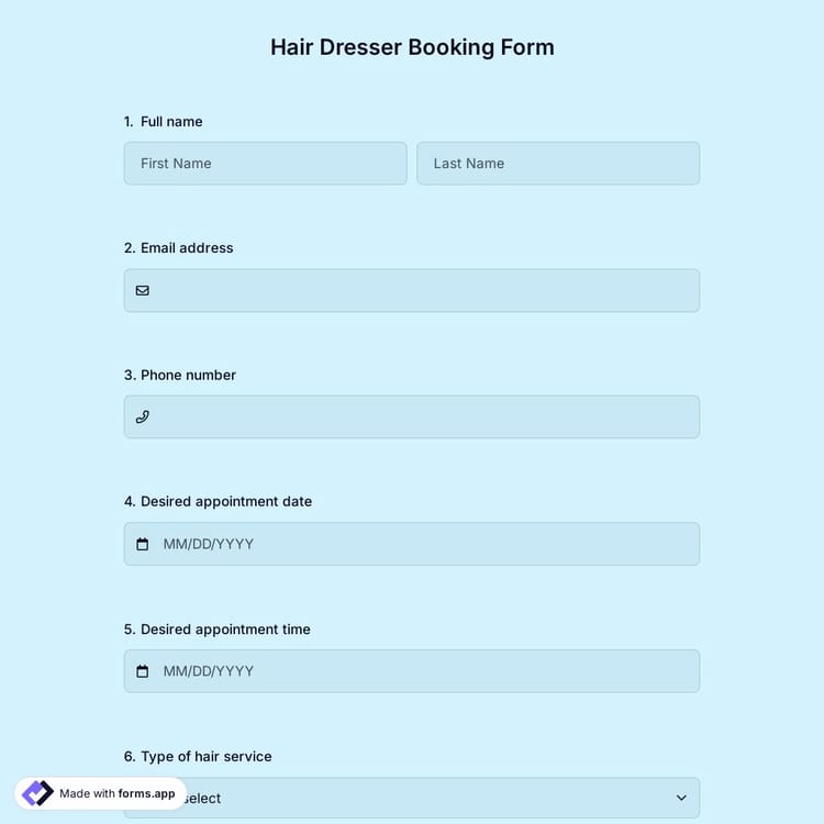 A hairdresser booking form is a simple yet powerful tool to schedule appointments and avoid overbooking. Save time, streamline operations, and enhance customer satisfaction with this customizable template. Start now for free.