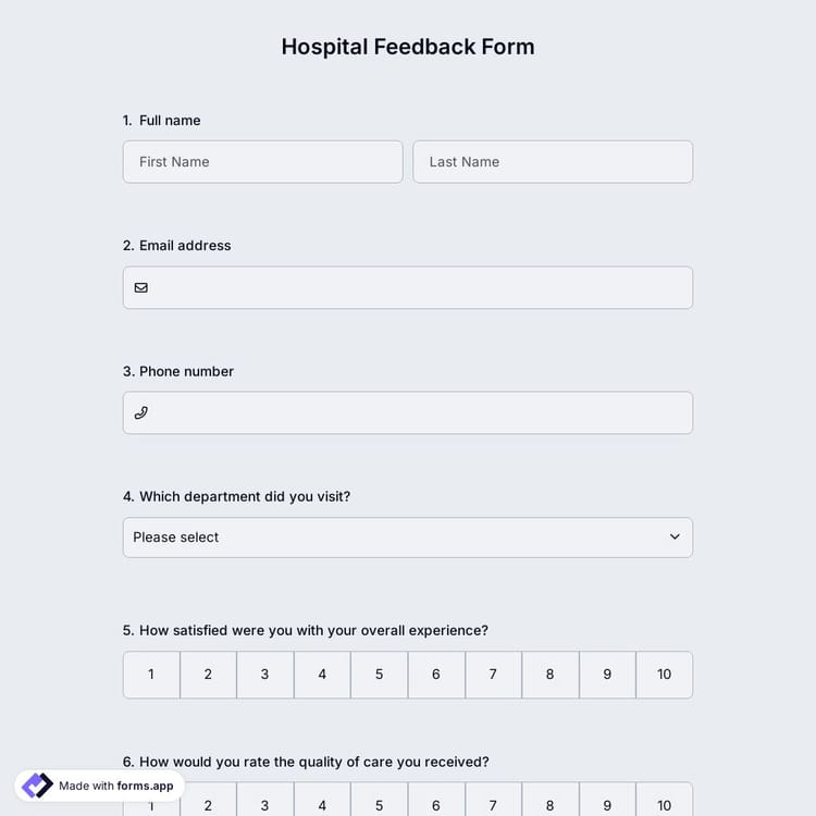 A hospital feedback form is essential for capturing patients' views regarding their healthcare experiences. Gathering feedback is essential for hospitals to pinpoint improvement areas, enhance the quality of patient care, and uphold high standards in healthcare delivery.