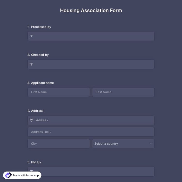 Are you looking for an online form where people can apply for a housing association home? Then forms.app is the solution for you! You can create a free form and share it in a minute with no coding knowledge required. Start creating your form using the housing association form template!