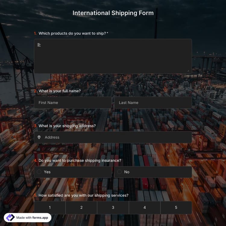 An international shipping form is a type of document used to inform the customs authorities of a transit or target country about the nature of a shipment crossing international borders. The details covered in the international shipping form could differ from one customs to another, as well as the overall procedures followed in issuing a customs clearance for the said shipment.To get the most out of an international shipping form, forms.app allows you to customize it at will. Just click the “Use Template” button, change the form fields to match the particular details, and share your registration form when ready!