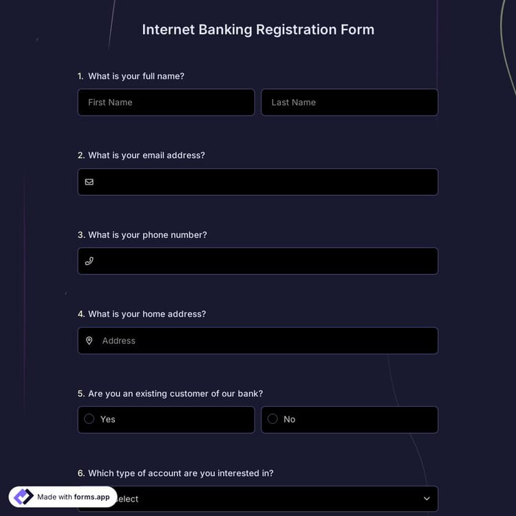 The easiest way to smoothly transition your customers to your bank’s digital banking platforms is an internet banking registration form. If you’re wondering how to build one, then start using forms.app’s internet banking registration form template by clicking the “Use Template” button now!