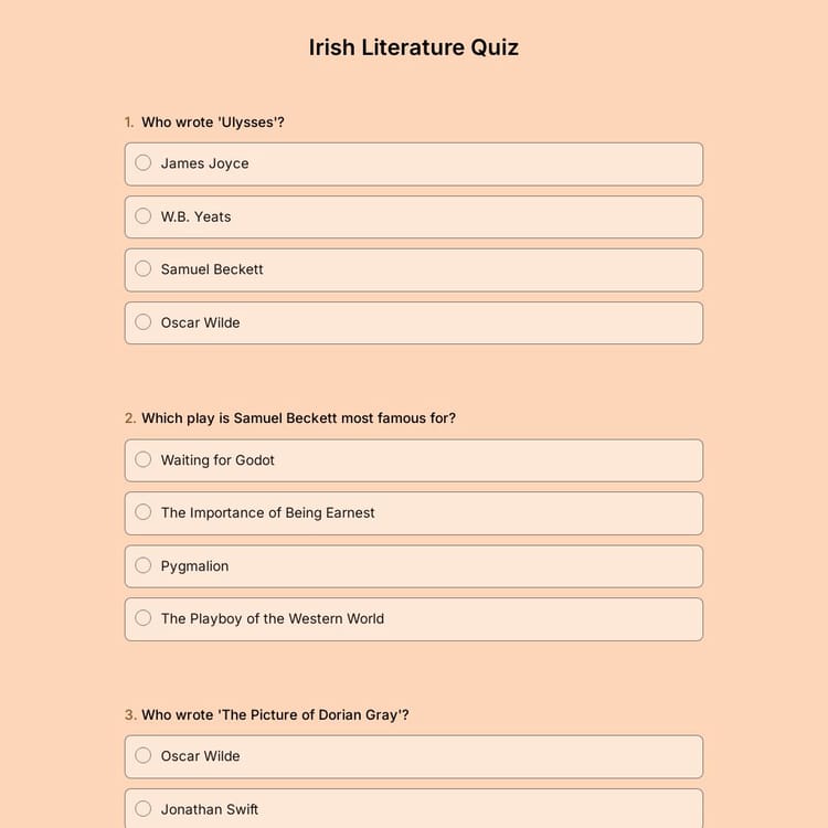 Whether you're a literature enthusiast or introducing others to Ireland's literary gems, this customizable quiz template is perfect for sparking conversations and testing knowledge. Get started for free today!