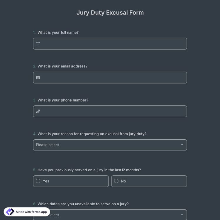 The duty excusal of a jury from the duty needs to be recorded as a kind of written paper. forms.app allows you to record the excusal. Thanks to the ease of the online tool, you will be informed super fast. Also, you can record the excusal with a signature field at the end of the document. To avoid missing these opportunities, start creating the online cancellation forms today.
