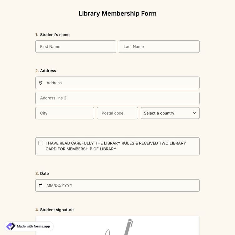 A library membership form is an important document for any library. It is used to collect information about the person signing up for a library card, including their name, address, and contact information. This free library membership form template comes with standard questions you may ask and help you create your online form faster.