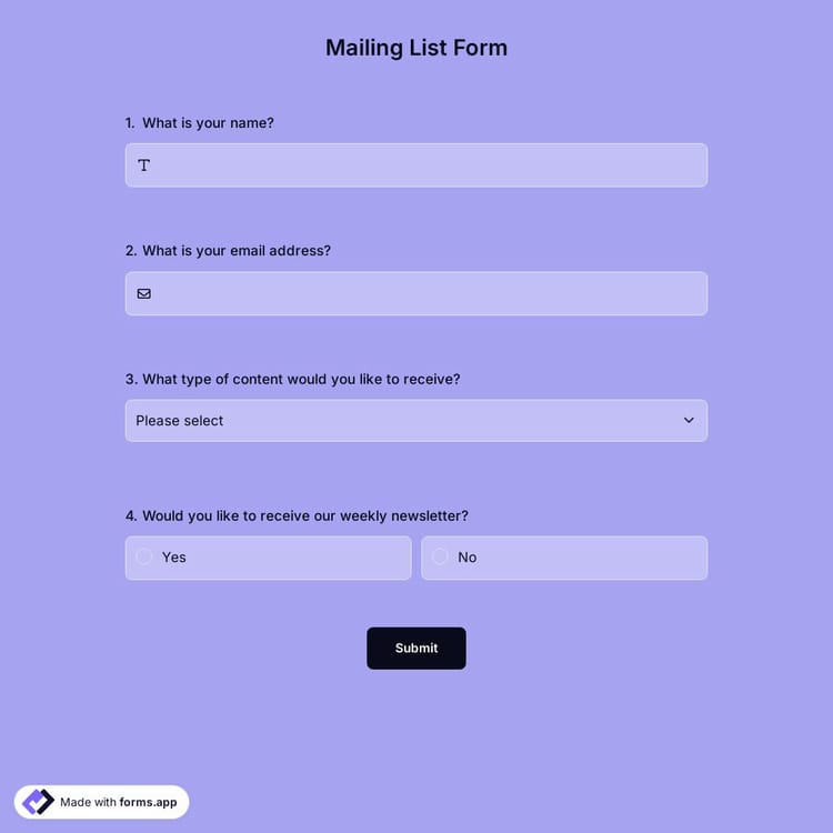 This mailing list form template can be practical when creating an opt-in form for managing and organizing your mailing lists. forms.app offers a free mailing list form template for you to redesign and make any changes you want. To create your form and get feedback, click ‘’Use Template’’ button.
