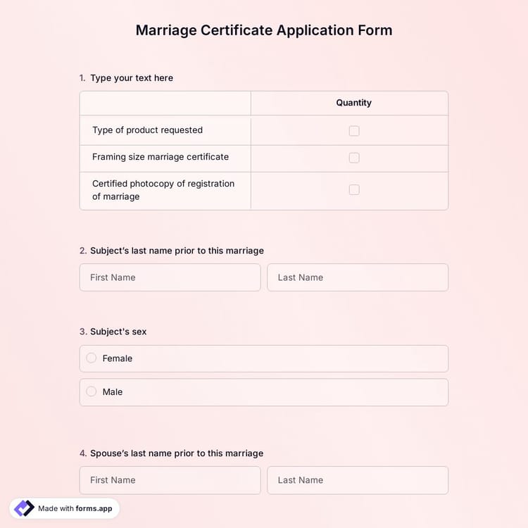 Just click the "use template" button and start customizing your marriage application form. By doing that, you can simplify the marriage certificate request process and complete your form efficiently. You can customize it to your preference and add form fields, such as signature field, without coding skills. Don't waste your time with redundant paperwork; get your job done with the free online form creator forms.app and create your marriage certificate application form now!