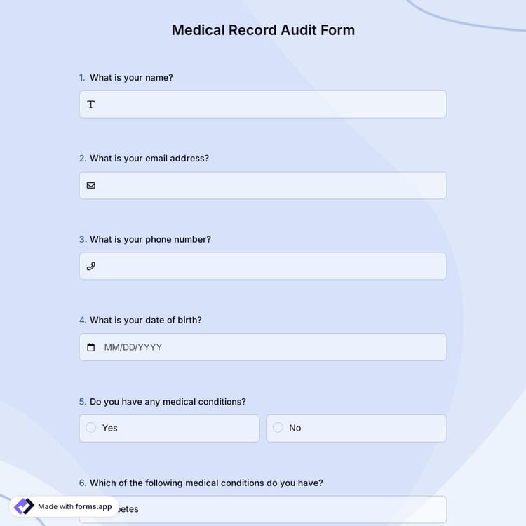 Healthcare professionals must keep accurate and complete medical records in order to provide effective healthcare. Therefore, with the help of an online form, you can not only keep all records accurately at hand but also make your work more practical. Use our free medical record audit form template to create your online form more easily!