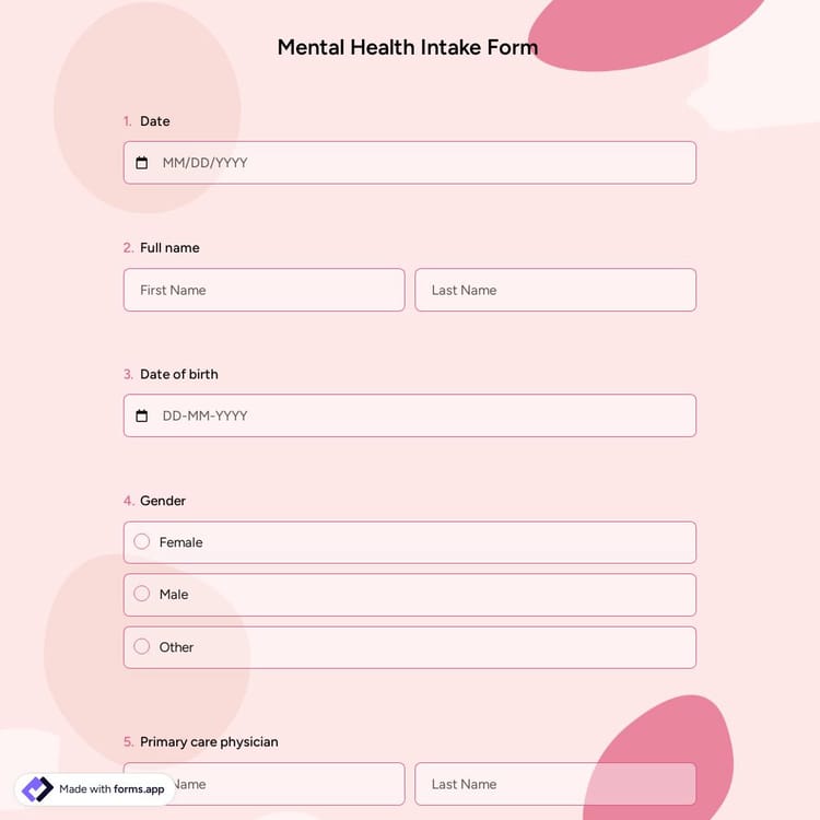 The mental health intake form is a document that captures the details of an individual's experience with their mental health. By using an online form, you can gather the necessary information in a standardized way before consulting with the patient. This mental health intake form template was created to help clinicians streamline the data collecting process and worm more efficiently.
