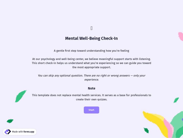 With the help of these absolutely free quizzes, learn about your patient’s mental health and well-being. You can also customize it to match your needs and standards. You can use forms.app features to enrich your template. To start with star rating would be a great way to get instant feedback from your patients.