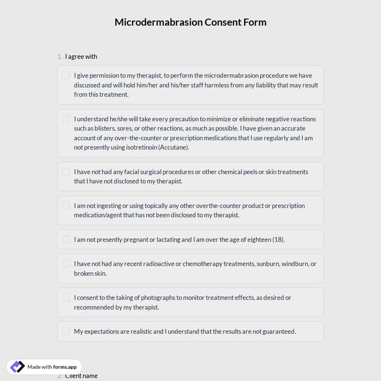 A microdermabrasion consent form is a document that must be signed by patients before microdermabrasion treatment. Patients should also be informed beforehand about the effect of this treatment. Thanks to this consent form, you can legally obtain the patient's consent to perform microdermabrasion.