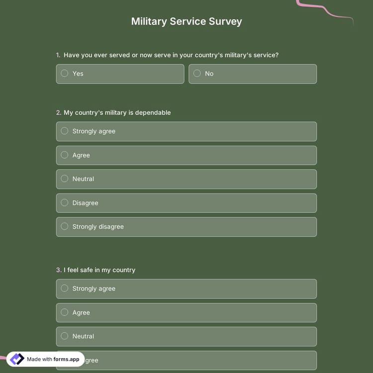 The military service survey is intended to get input on the military experience from both current and past service members. The data gathered will be utilized to better comprehend the requirements and experiences of people who have served as well as to pinpoint areas where military service may be improved.