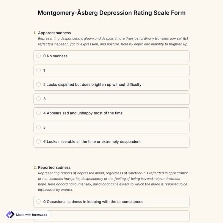 forms.app offers a straightforward way of using this standardized questionnaire. Professionals can also customize it to match it perfectly with the client and get better results. You can make it more professional with features such as a calculator option, star rating, and opinion scale. Click on the “Use Template” button now and get started with this Montgomery-Åsberg depression rating scale template for free.
