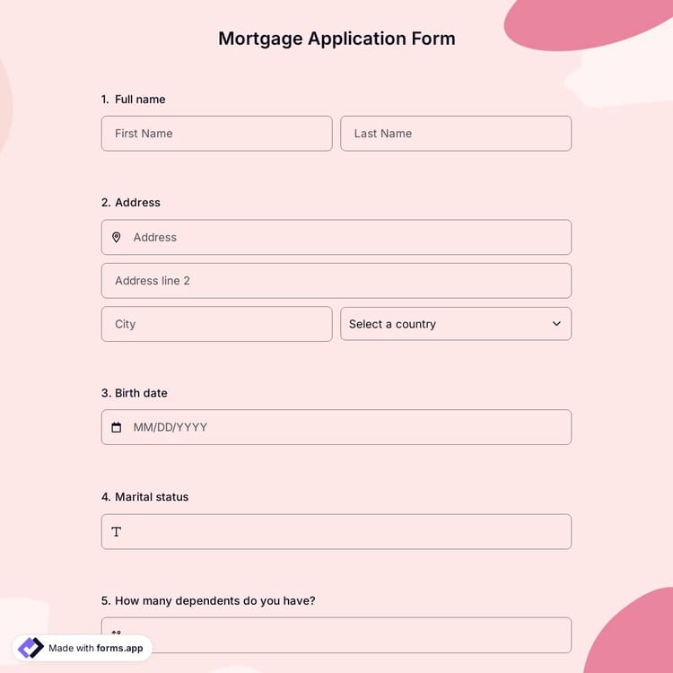If you provide consumer, residential, business and personal loans, add a unique mortgage application form to your website and save time. Quickly create this form using forms.app's free templates for everyone. Choose a template now to easily create a form without any coding knowledge.