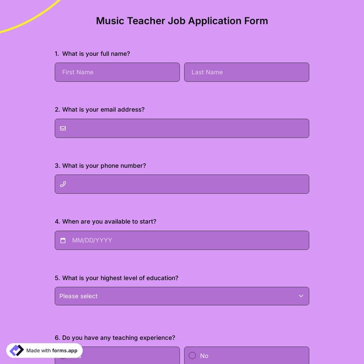 View this music teacher job application form and click on "use template" after making sure this is what you are looking for.