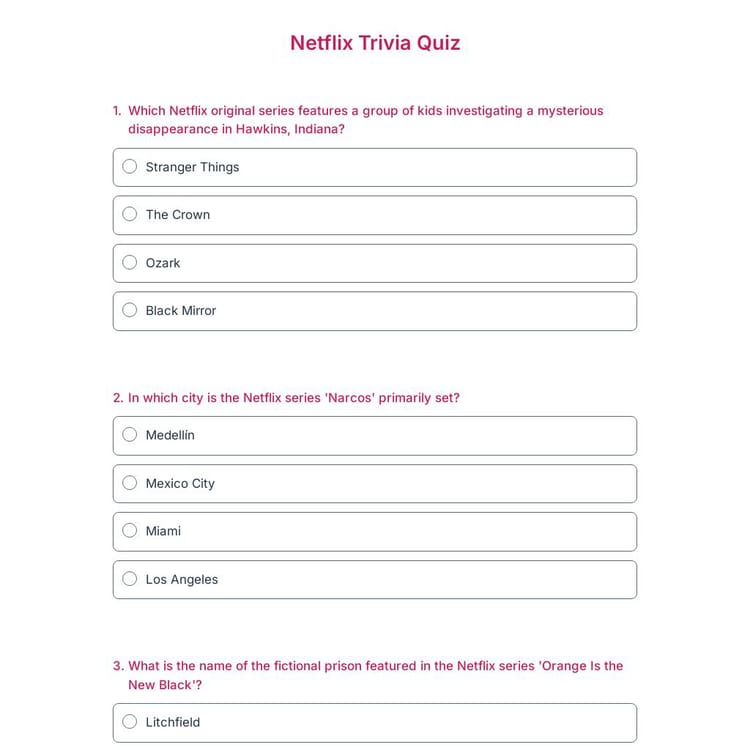 Digital quizzes are a great way to challenge your friends and fellow binge-watchers with a Netflix-themed trivia quiz. With forms.app, you can create a Netflix trivia quiz template and discover who truly knows their streaming shows and movies best. Start now for free!