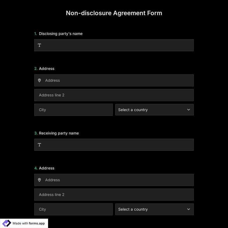 If you are a disclosing party and your work involves trade secrets, you need your partners to sign an NDA. The best way to do this is by using a form builder with a signature field. Whether you will use this form for only collecting information or get it signed by other parties using forms.app provides you with an easy way to create your agreement form.
