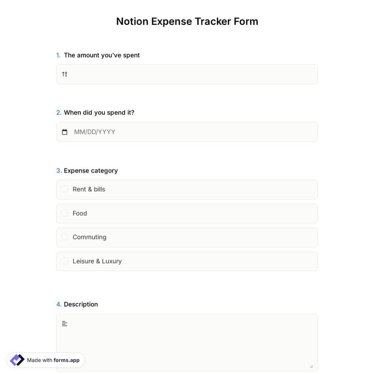Are you looking for an easy and quick way to track your expenses on Notion? Use this free Notion expense tracker form template to create your own form and embed it on your page. Create your expense tracker form on forms.app and start keeping your expenses on track today!