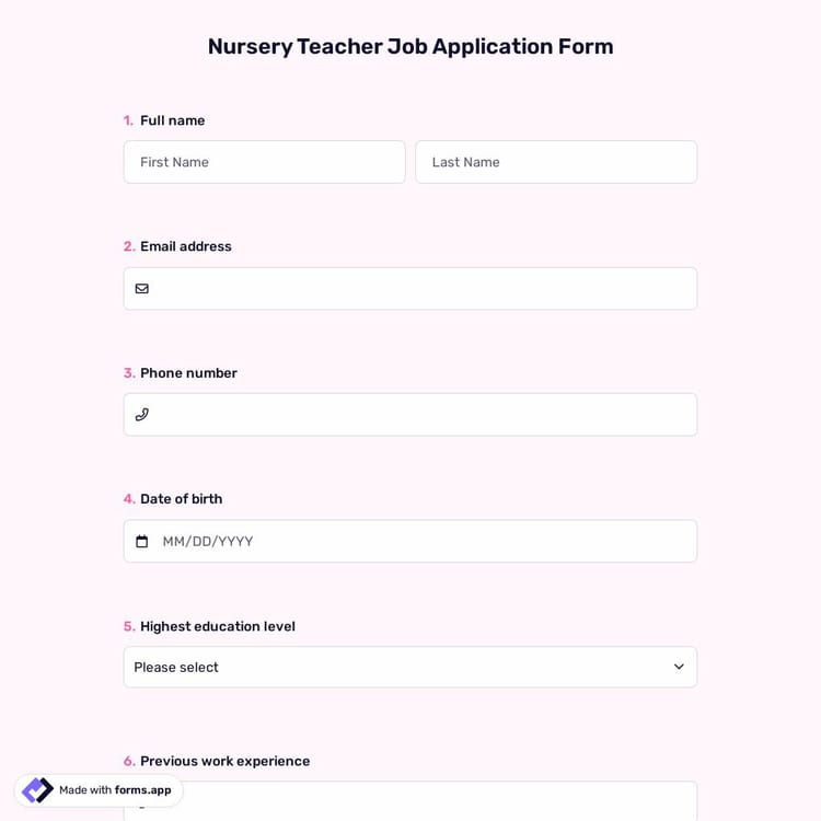 Whether you are creating a job application form or a membership registration form, forms.app offers you premium-quality templates for free. These application form templates come with common questions or form fields you would probably like to include in your form. Naturally, this will save you time and help you create better forms and surveys in a shorter time. So, choose one of our free form samples to create professional online forms today.