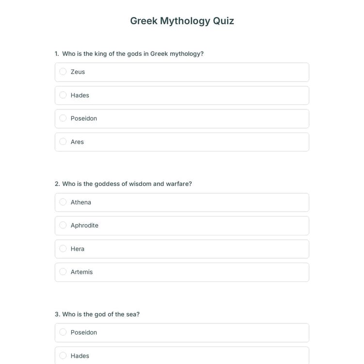 A Greek mythology quiz is an interactive tool designed to challenge participants’ knowledge about ancient Greek myths, gods, heroes, and stories. With forms.app, you can easily create a quiz that is both entertaining and educational, perfect for classrooms, trivia nights, or personal enjoyment.