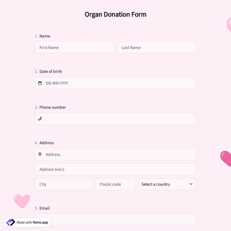 The need for organ donation is greater than ever, but the number of donors is declining. This online organ donation form makes it easy and convenient for people to donate organs. By making the process online, you can reach more people as they won’t leave the comfort of their own homes. So, get started today with this organ donation form template on forms.app!
